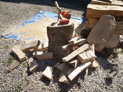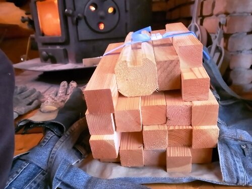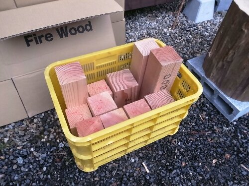 ご近所の大工さんから頂戴した建築端材も割って焚きました