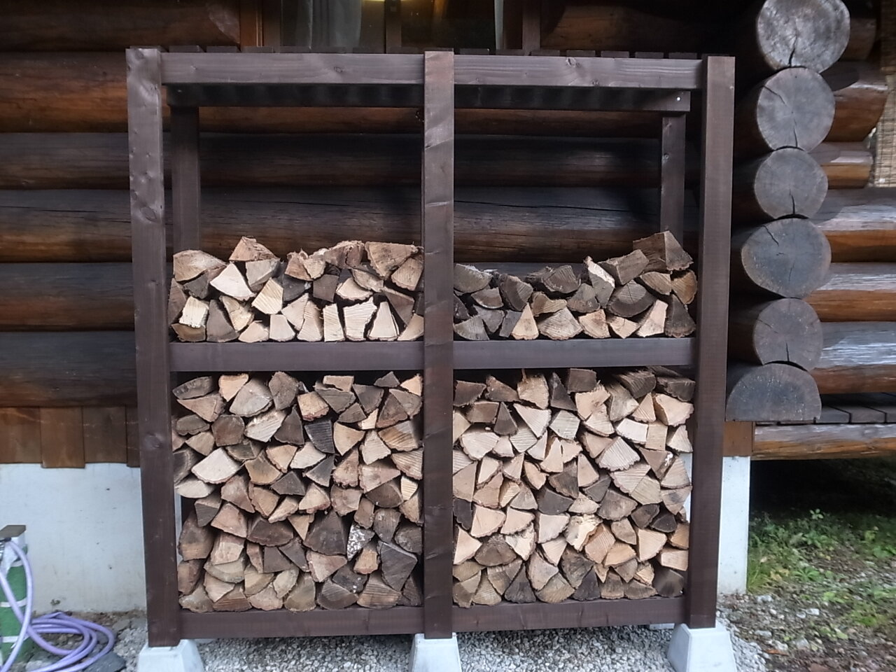 およそ薪棚の2/3が埋まりましたので、収納能力は約525kgの1㎥程度でしょうか