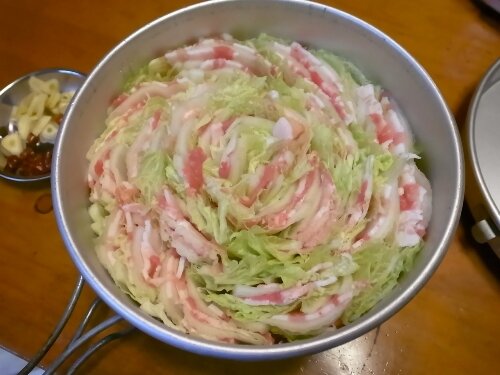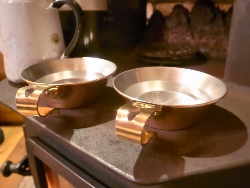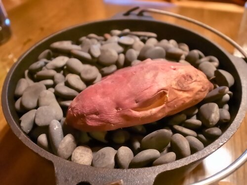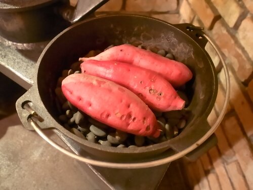 ダッチオーブンを薪ストーブに乗せて石焼きにします