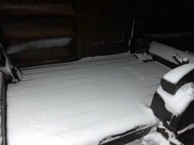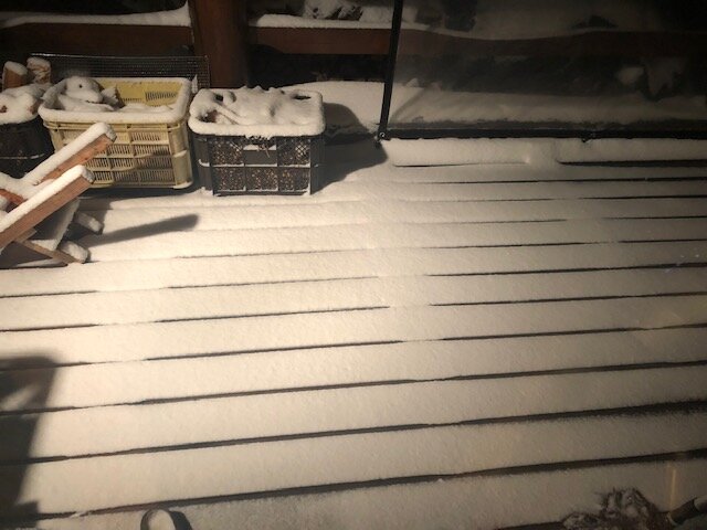 屋根付きデッキにまで雪が吹き込んでます